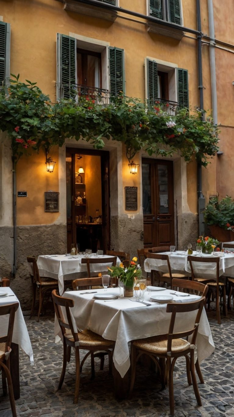 Ich bin die Beobachterin, die stille Zeugin dieses Augenblicks, bevor die Welt wieder laut wird. Ich berühre mit den Fingerspitzen die kühle, glatte Oberfläche des Weinglases auf dem nächstgelegenen Tisch. Es ist ein Moment der perfekten Inselhaftigkeit. Die Farben – das warme Gold der Wand, das tiefe Grün der Pflanzen, das reine Weiß der Tischwäsche – sie sind so klar, so rein. Ich fühle eine leichte Melancholie, ja, aber es ist eine süße, poetische Traurigkeit, die mich daran erinnert, wie flüchtig die Schönheit der Stille ist. Bald werden Stimmen, Lachen, das Klirren von Besteck diese Szene füllen. Aber jetzt, in dieser Sekunde, gehört dieser ganze, wunderschön vorbereitete Ort nur mir. Und ich halte ihn fest, diesen stillen, goldenen Atemzug, bevor die Nacht beginnt.